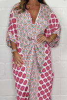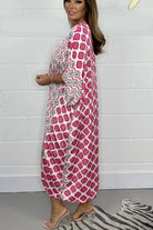 This V-neck geometric print dress combines a loose, flattering fit with modern style. Featuring 3/4 sleeves and a pleated ruffle waist, this dress creates a chic silhouette perfect for casual outings or special events. The lightweight fabric ensures you stay comfortable all day, while the bold geometric patterns make it a statement piece in your wardrobe.