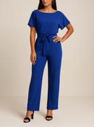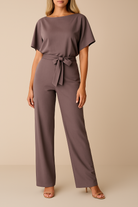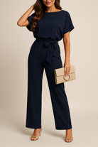 Elevate your wardrobe with this belted wide-leg jumpsuit, designed for effortless elegance and versatility. Featuring a relaxed short-sleeve top with a flattering round neckline, this jumpsuit is cinched at the waist with a matching belt tie that enhances the silhouette. The wide-leg trousers create a sleek, elongating effect, perfect for both casual sophistication and formal occasions. Crafted from comfortable, high-quality fabric, it offers a polished look with ease of movement. Pair it with heels for an elegant evening look or with flats for a chic daytime outfit.